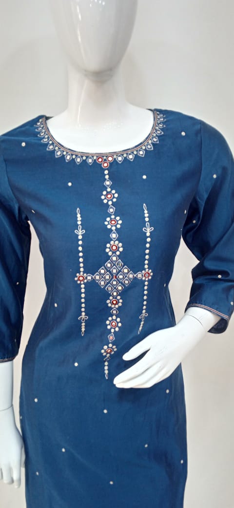 The straight-cut kurta features a breathtaking hand-embellished yoke, where traditional motifs are intricately brought to life with delicate mirror work and resham (silk thread) embroidery. This meticulous detailing provides a captivating sparkle against the deep, rich blue base.