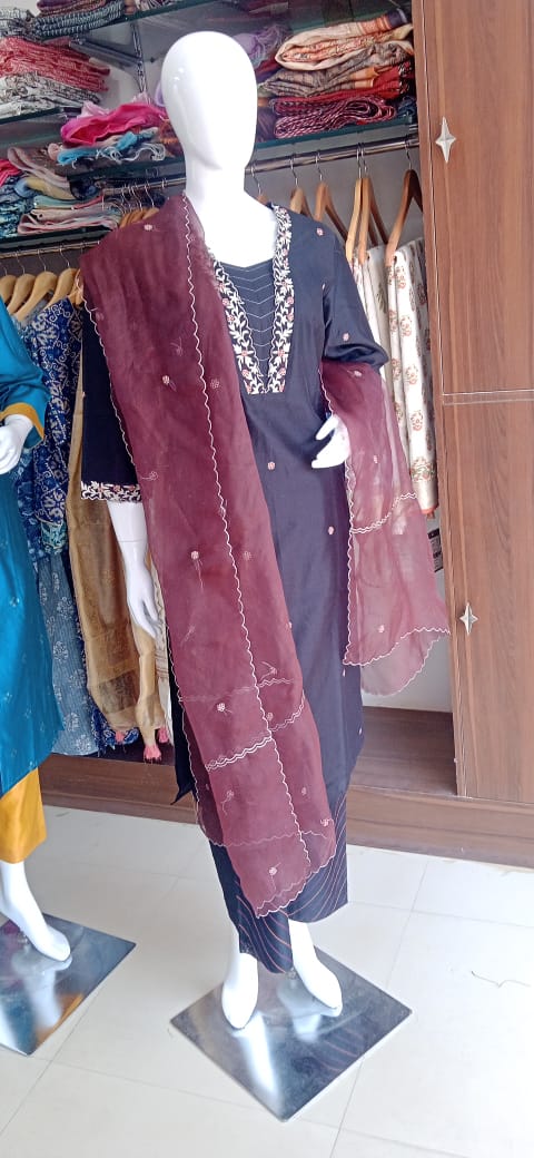 Step into an aura of refined elegance with our Midnight Petal Ensemble, a masterpiece crafted from a superior Cotton Silk blend. This exquisite fabric marries the breathable comfort of cotton with the subtle sheen and elegant drape of silk, ensuring a feel as luxurious as its appearance.